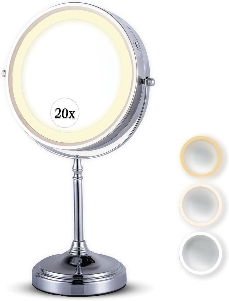 MIRRORVANA Ultra Zoom 20X Magnifying Lighted Table Mirror for Makeup - 20X & 1X Dual Sided LED Make-up Mirror with 3 Light Modes, Rechargeable Battery with USB Cable - 8" Wide & 15" Tall (Chrome)